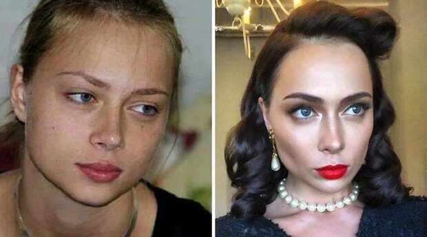 Девочка из провинции Настасья Самбурская в 21 год выросла к 32-м в женщину-вамп благодаря яркому макияжу, смене цвета волос и да-да, бровям! А еще куда-то исчезли "детские" щечки (вероятно, благодаря качественному макияжу).